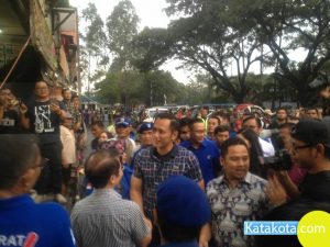 AHY yang menggunakan pakaian kasual polo biru dengan bawahan jeans bersepatu biru datang pukul 17.30 WIB. Ia disambut para pedagang serta kader dengan bersalaman dan berfoto bersama.