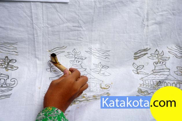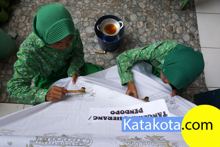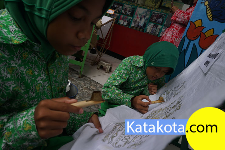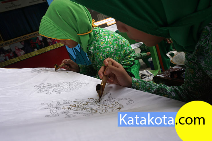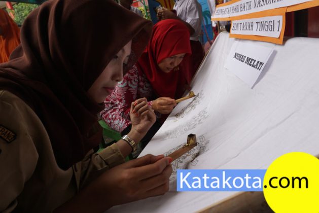 Menyambut hari Batik, ratusan siswa SD Negeri 1 Tanah Tinggi menggelar belajar membatik di halaman sekolah, Tangerang, Senin (2/10).Kegiatan membatik dilakukan dalam rangka mengenalkan budaya yang dimiliki Indonesia kepada anak-anak sejak dini. Foto : Fajrin/Katakota