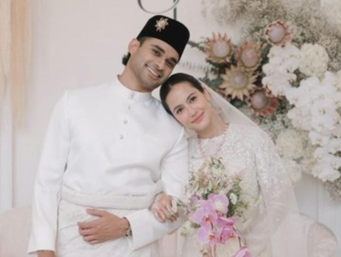 Pevita Pearce dan suaminya tampil serasi dalam balutan busana pengantin khas Melayu memasang wajah semringah.
