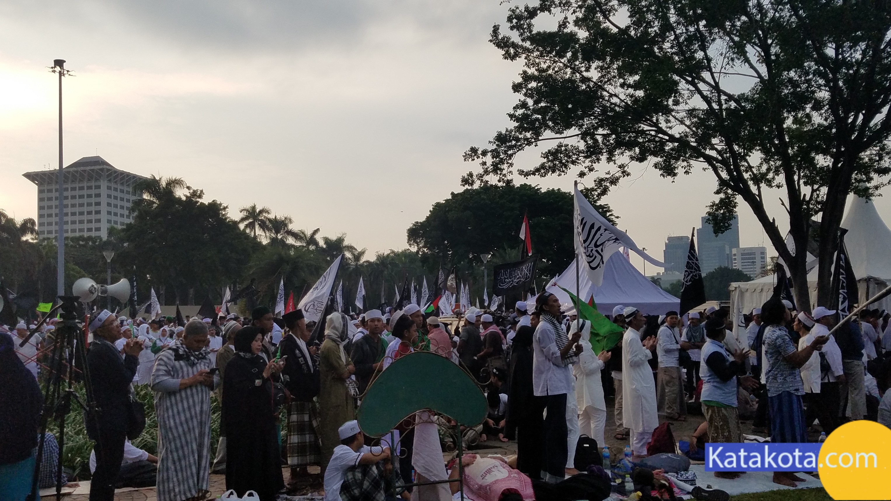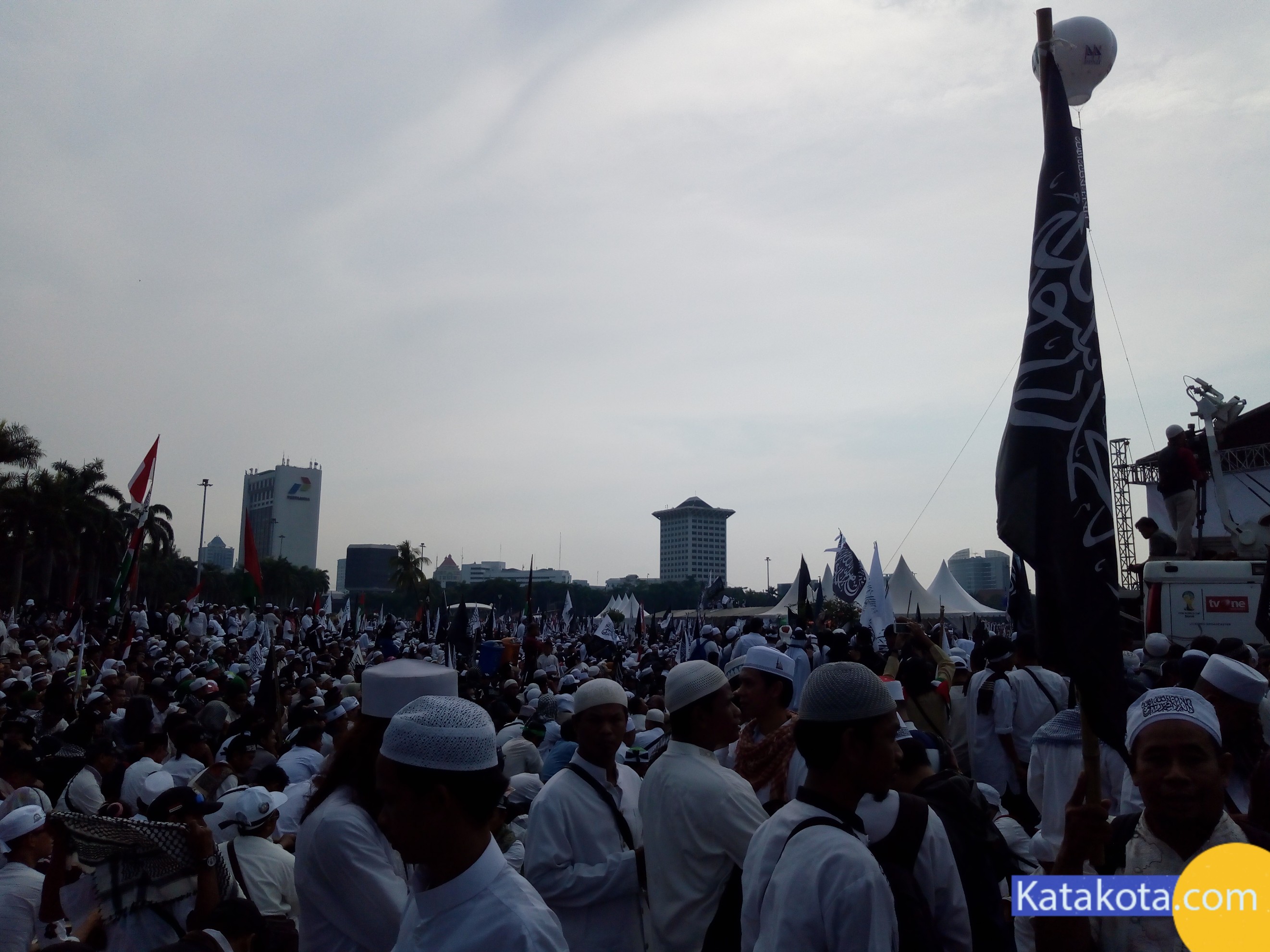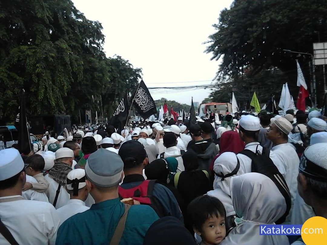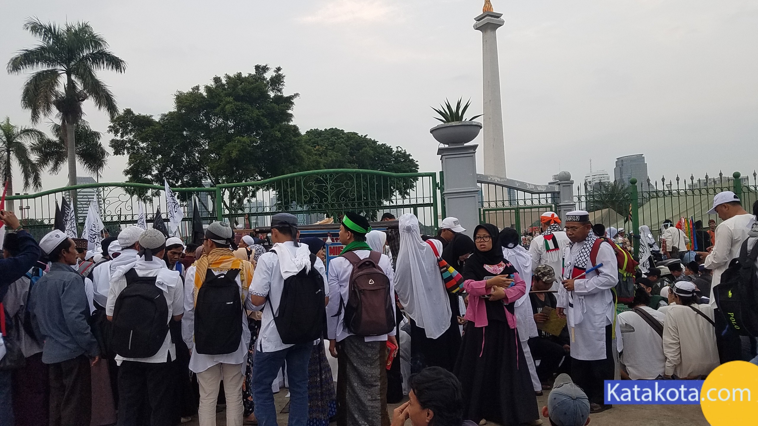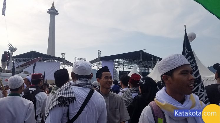 Katakota.com, -Massa reuni 212 berkumpul di Monumen Nasional (Monas), Jakarta. Bendera dan panji-panji dikibarkan di aksi reuni akbar 212. Mulai dari bendera merah putih, bendera berlafal tauhid, hingga bendera Palestina terlihat diusung para peserta aksi. Selain bendera, ikat kepala dan topi hitam dengan kalimat tauhid juga menjadi ciri khas para peserta, selain pakaian putih-putih yang dikenakan.