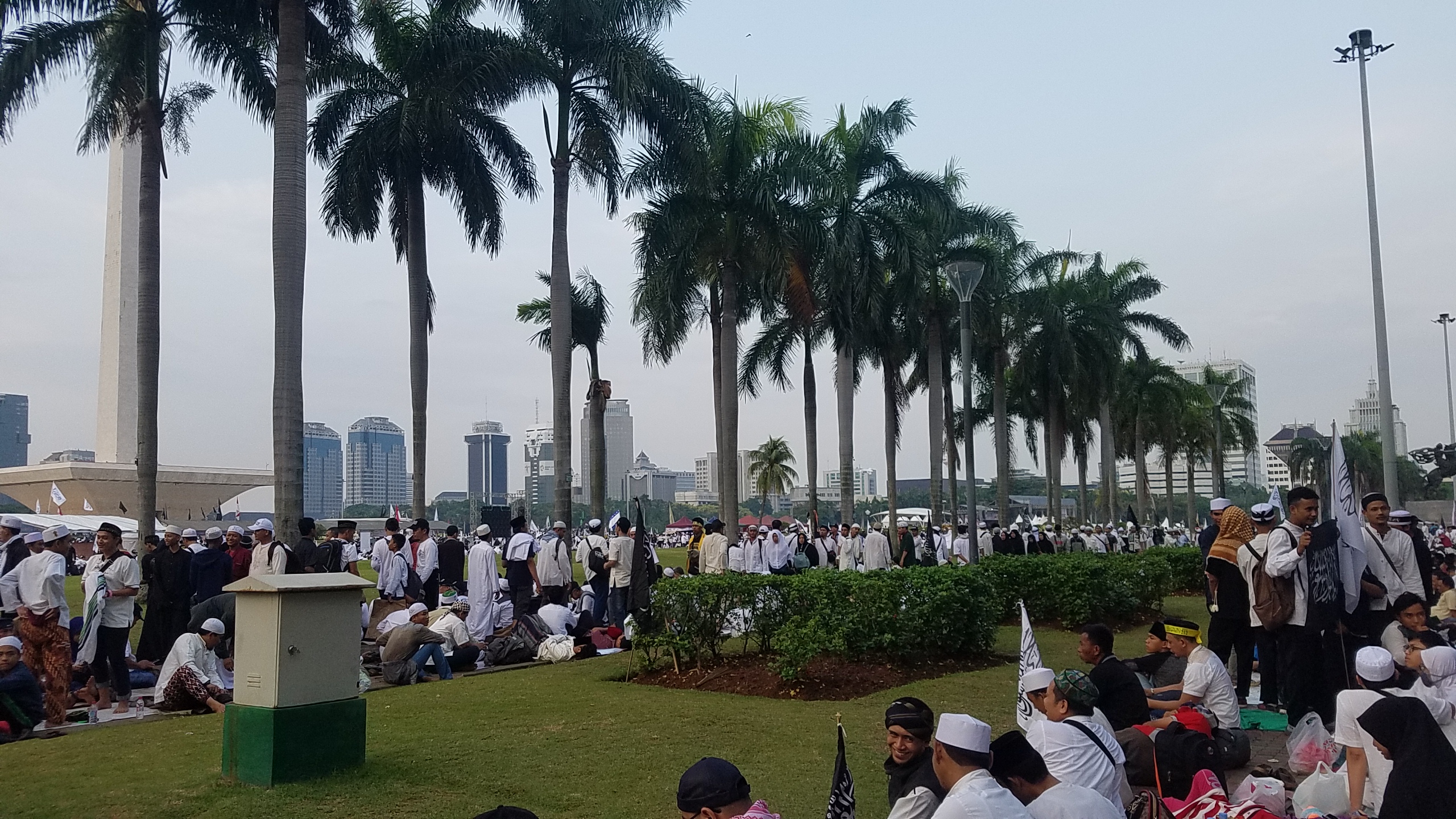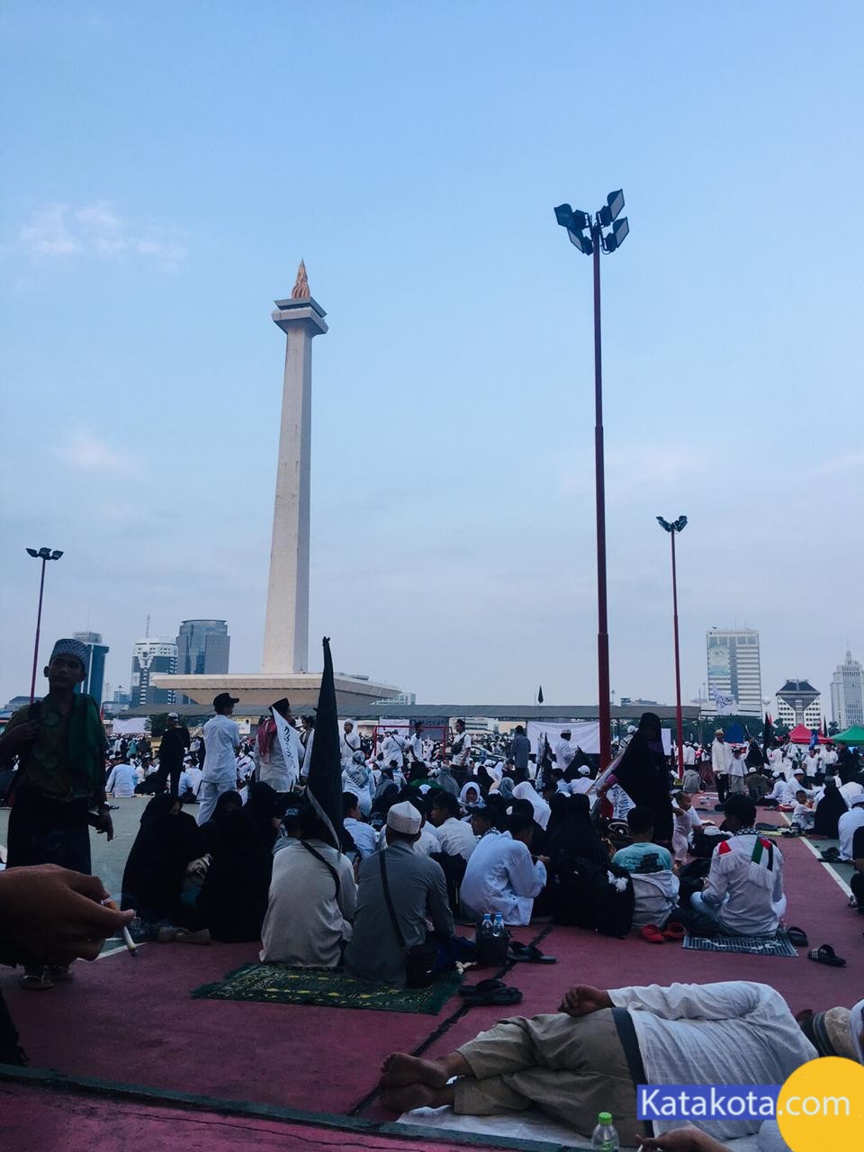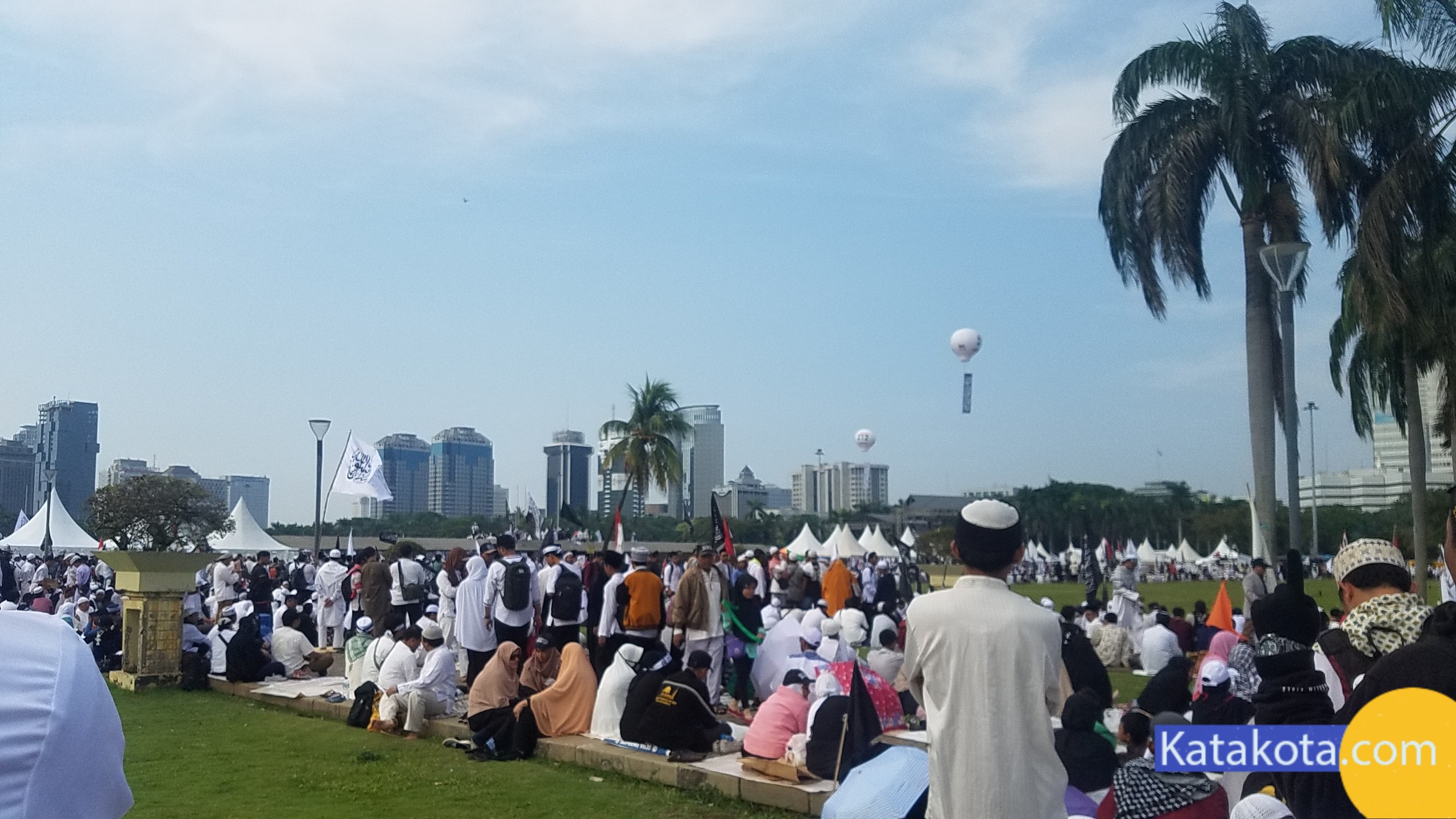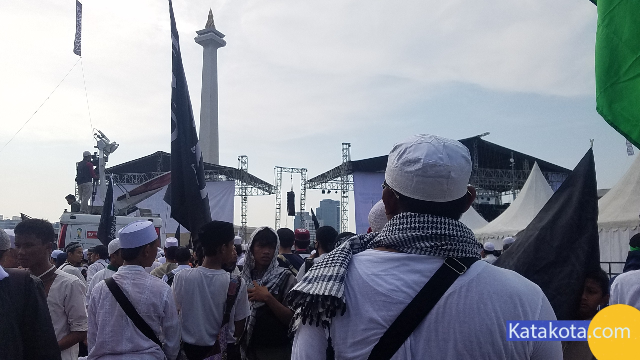 Katakota.com, -Massa reuni 212 berkumpul di Monumen Nasional (Monas), Jakarta. Bendera dan panji-panji dikibarkan di aksi reuni akbar 212. Mulai dari bendera merah putih, bendera berlafal tauhid, hingga bendera Palestina terlihat diusung para peserta aksi. Selain bendera, ikat kepala dan topi hitam dengan kalimat tauhid juga menjadi ciri khas para peserta, selain pakaian putih-putih yang dikenakan.