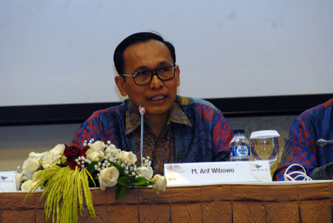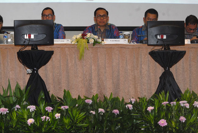 Direktur Utama Garuda Indonesia, Arif Wibowo didampingi direktur lainnya memberikan paparan kinerja dalam RUPS tahunan 2016 di Auditorium Garuda City Center, Tangerang, Banten, Jumat (15/4). Garuda Indonesia Tbk membukukan laba sebesar 78 juta dolar AS sepanjang 2015. KataKota/Fajrin