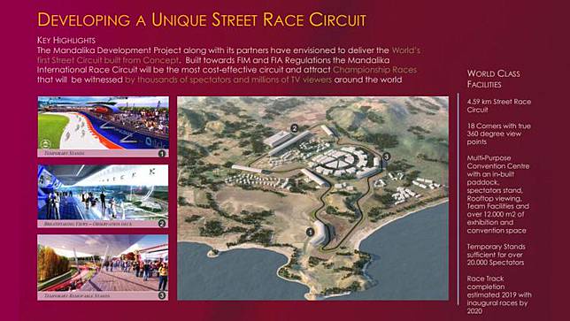 Rancangan sirkuit ini digadang-gadang akan serupa dengan sirkuit yang ada Monako dan Makau. Bila tak ada jadwal balap, sirkuit ini bisa dipakai sebagai jalan raya.