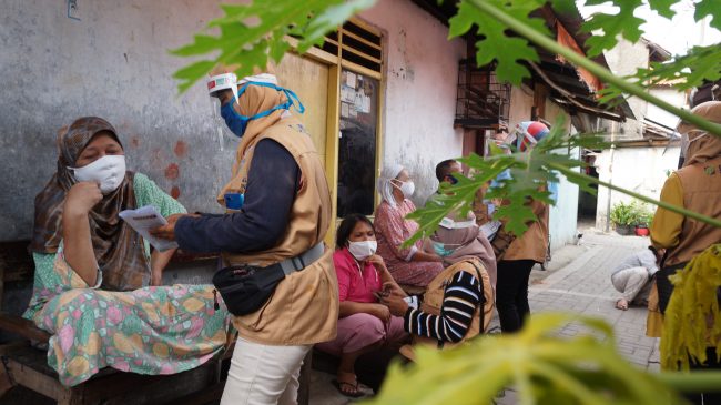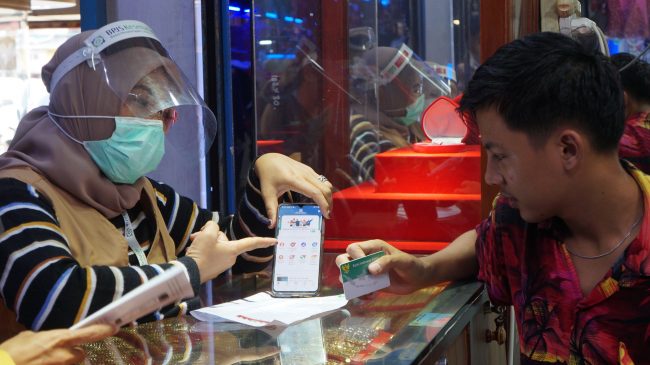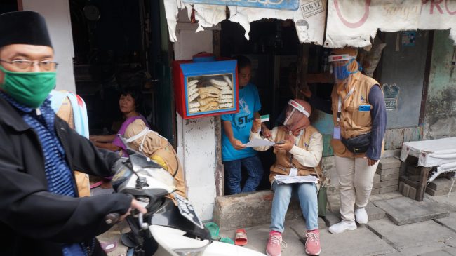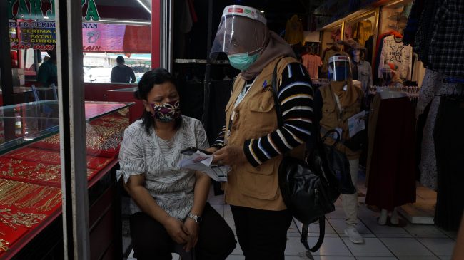 Kader BPJS Kota Tangerang melakukan sosialisasi kepada pedagang di kawasan pasar Kebon besar, Tangerang, Jumat (24/7). Sosialisasi meliputi pentingnya penggunaan pelayanan kesehatan pemerintah serta penggunaan aplikasi mobile JKN. Foto : Eky Fajrin/Katakota.com