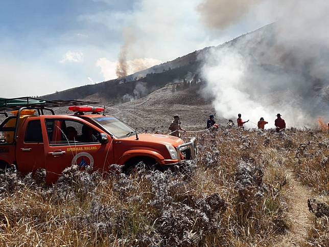 “Api menjalar ke Bukit Teletubbies. Kondisi rumput kering, angin kencang dan berbukit menyebabkan api sulit dipadamkan. BPBD, MA BBTNBTS dan relawan terus memadamkan,” ujar Kepala Pusat Data Informasi dan Humas BNPB Sutopo Purwo Nugroho melalui akun Twitter, Senin (3/9).