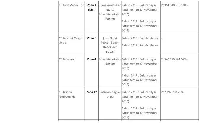 Adapun total tunggakan BHP frekuensi PT Jasnita sebesar Rp 2,1 miliar.