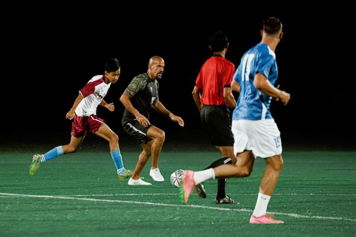 Mantan pemain Manchester United ini bermain bola dengan beberapa anak dari Bali United Youth dan Bali United Woman dibawah penerangan 800 LUX yang menyorot lapangan utama.