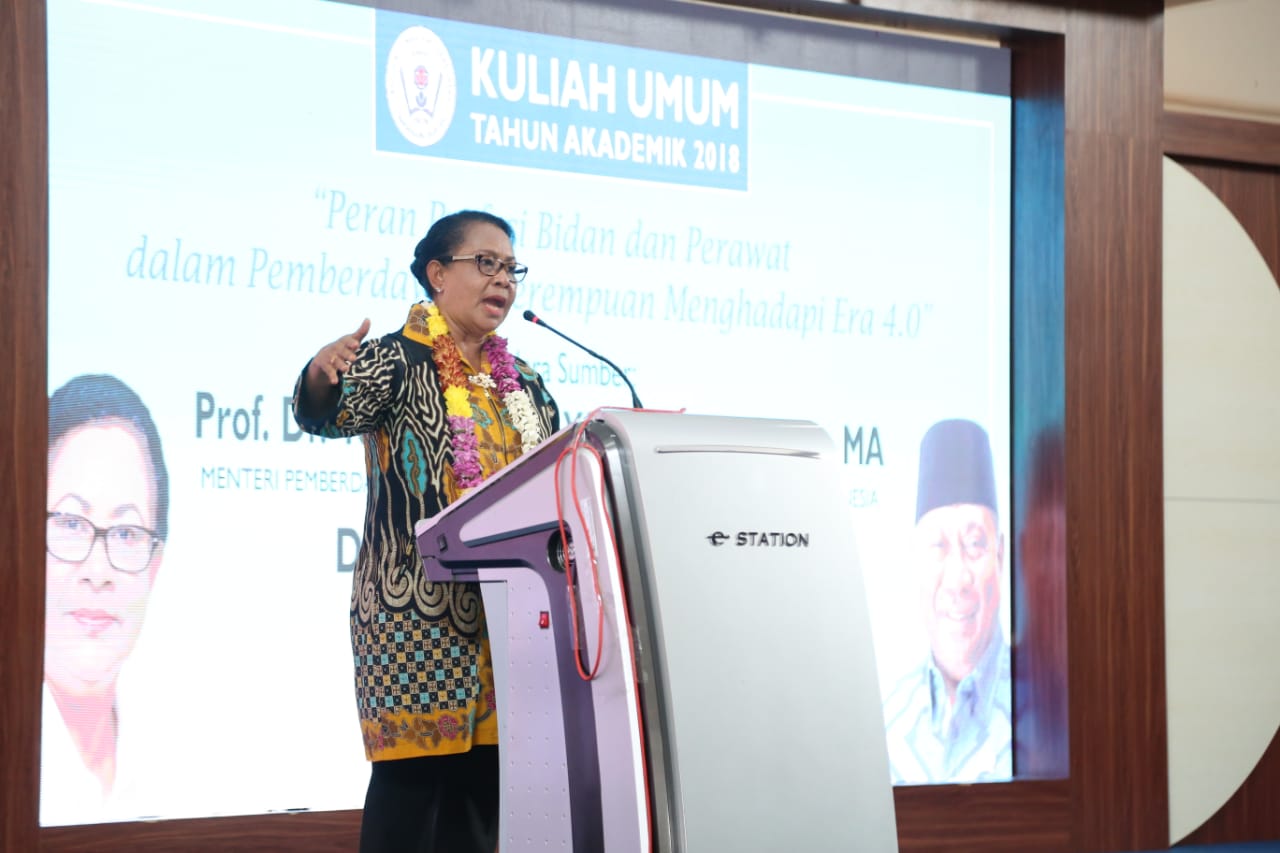 “Hadirnya revolusi era 4.0 harus dapat dimanfaatkan dan dikelola dengan baik oleh kaum perempuan termasuk bidan, perawat, dan tenaga medis lainnya, sebab hal tersebut memiliki prospek yang menjanjikan bagi posisi perempuan sebagai bagian dari agen perubahan. Besar harapan agar hasil dari kuliah umum ini dapat meningkatkan pemahaman seluruh bidan dan perawat di STIKES Yatsi tentang peran pemberdayaan perempuan dalam menghadapi revolusi era 4.0,” papar Menteri Pemberdayaan Perempuan dan Perlindungan Anak (PPPA), Yohana Yembise dalam Kuliah Umum “Peran Profesi Bidan dan Perawat dalam Pemberdayaan Perempuan menghadapi Era 4.0”, di Kota Tangerang.