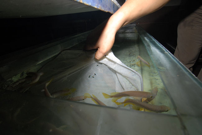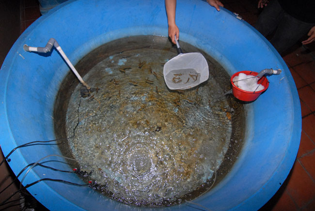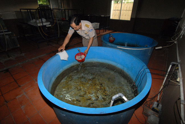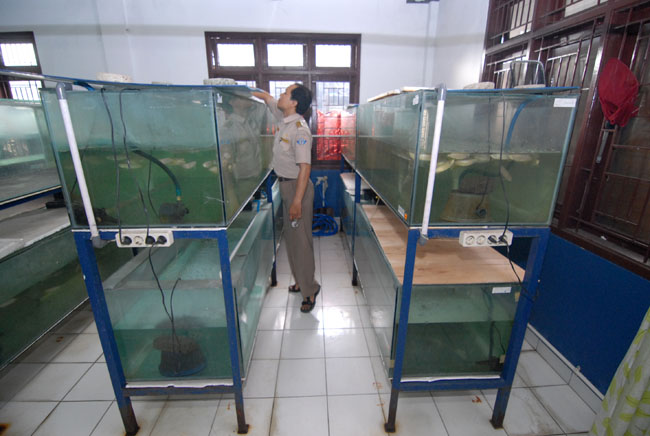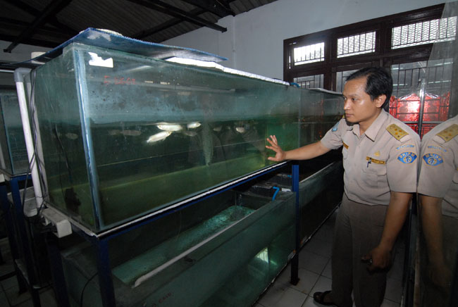 Petugas Balai Besar Karantina Ikan dan Pengendalian Mutu (BBKIPM) Wilayah 1 Jakarta Bandara Internasional Soekarno-Hatta (Soetta) memeriksa ikan arwana yang akan diselundupkan, Tangerang, Banten, Kamis (14/4). Diamankan sekitar 1.171 ekor ikan Arwana berbagai jenis. KataKota/Fajrin