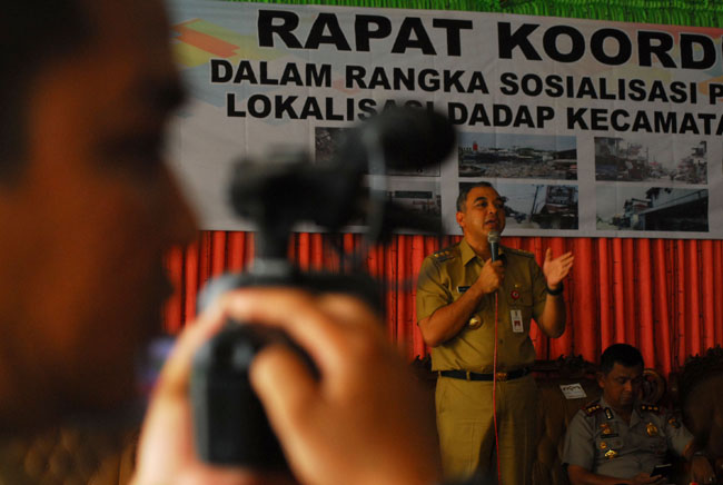Sekretaris daerah kabupaten Tangerang Iskandar Mirsad saat memaparkan rencana relokasi warga di kawasan Dadap dan penertiban lokalisasi Dadap, Kabupaten Tangerang, Banten, Senin (14/3). Penertiban lokalisasi Dadap tersebut akan dilakukan 26 Mei mendatang. KataKota/Fajrin