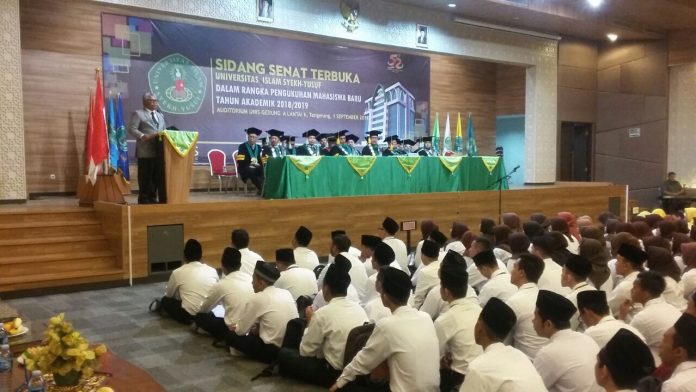 Tangerang, Katakota.com – Ribuan mahasiswa baru Universitas Islam Syekh Yusuf (Unis) Tangerang mengikuti pengukuhan mahasiswa baru pada Sabtu (1/9/2018). Mahasiswa baru diminta untuk “melek”teknologi dan beradaptasi dengan perkembangan jaman dalam meningkatkan kompetensi dan pengetahuannya.