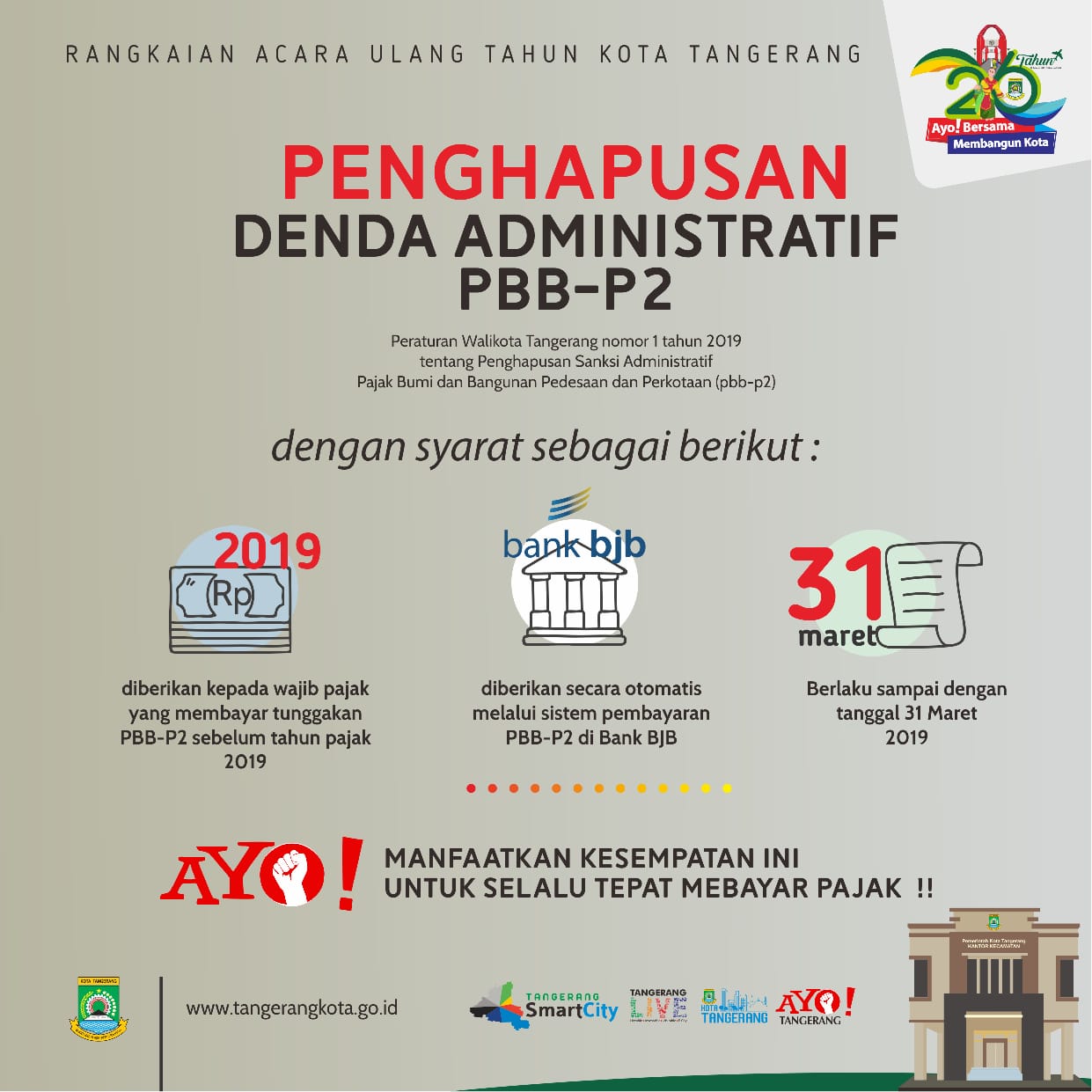 Tangerang, Katakota.com– Pemerintah Kota (Pemkot) Tangerang menghapuskan sanksi administratif (denda) Pajak Bumi dan Bangunan (PBB) Perkotaan dan Pedesaaan (P2) bagi warga Kota Tangerang. Penghapusan denda PBB ini dilaksanakan dalam rangka menyambut hari jadi Kota Tangerang ke 26 yang jatuh pada 28 Februari 2019.