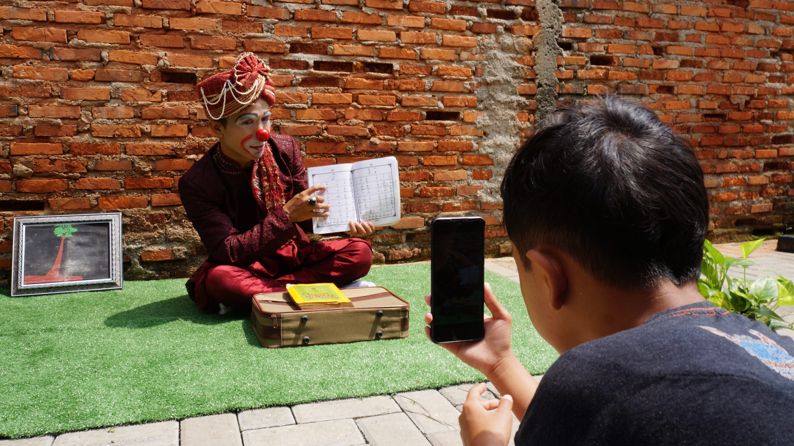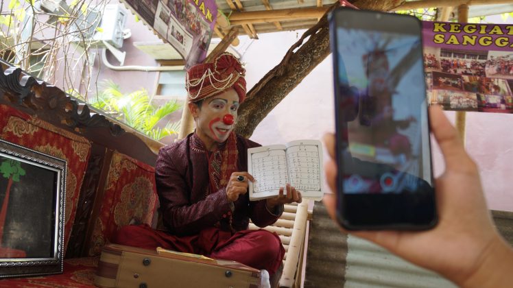 Yahya (38) di bantu anak nya saat mengajar mengaji kepada anak didiknya melalui saluran media daring dengan menggunakan ponsel pintar. Kegiatan belajar secara daring ia lakukan demi kemajuan anak didiknya di masa pandemi sehingga tetap bisa tumbuh, Pinang, Tangerang. Foto : Eky Fajrin/Katakota