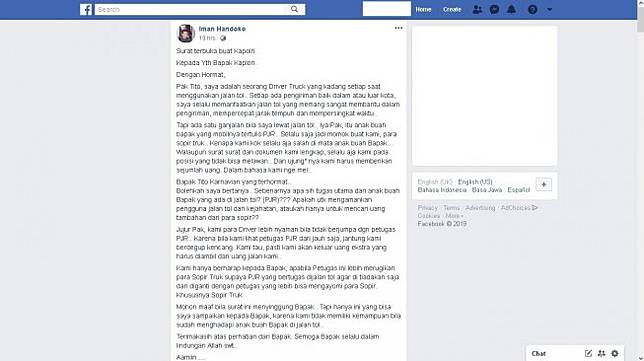 Si penulis surat adalah pengguna akun Facebook bernama Iman Handoko. Ia menulis surat itu di Facebook pada Senin (22/4/2019).