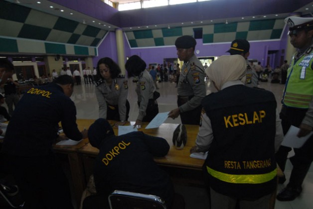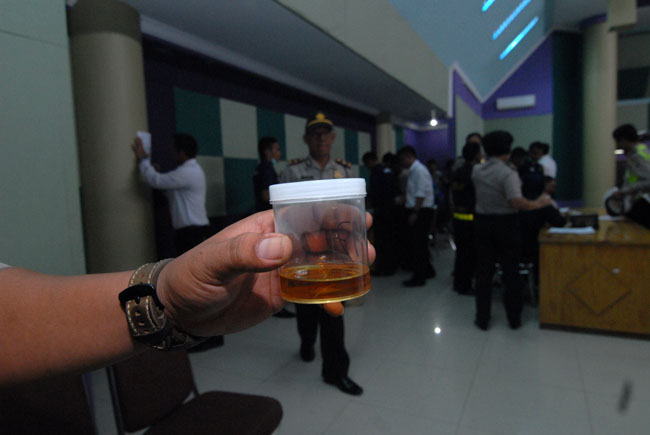 Anggota polisi Polres kota Tangerang mengikuti tes urin yang dilakukan oleh Dit Propam Polda Metro Jaya, Tigaraksa, Kabupaten Tangerang, Banten, Kamis (7/4). Sebanyak 300 anggota kepolisian dari Polresta Tangerang mengikuti tes urine. KataKota/Fajrin