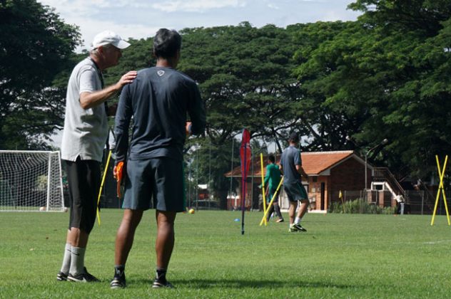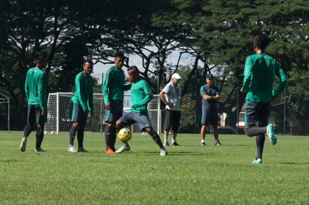 Sejumlah pemain timnas sepakbola Indonesia menjalani pemanasan sebelum latihan di lapangan sepakbola Sekolah Pelita Harapan (SPH), Karawaci, Kabupaten Tangerang, Banten, Sabtu (29/10). Sebanyak 27 pemain dipanggil oleh pelatih timnas Indonesia Alfred Riedl. KataKota/Fajrin