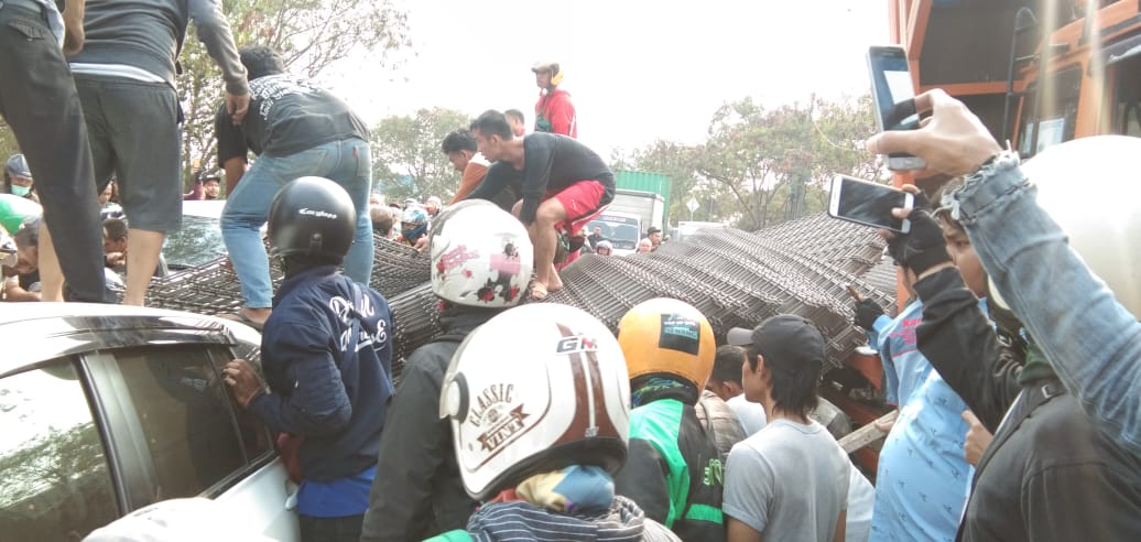 Robert menuturkan, akibat oleng, muatan kerangka besi bangunan yang diangkut truk bernopol B-9189-EZ terjatuh dan meniban sejumlah kendaraan yang turut melintas.