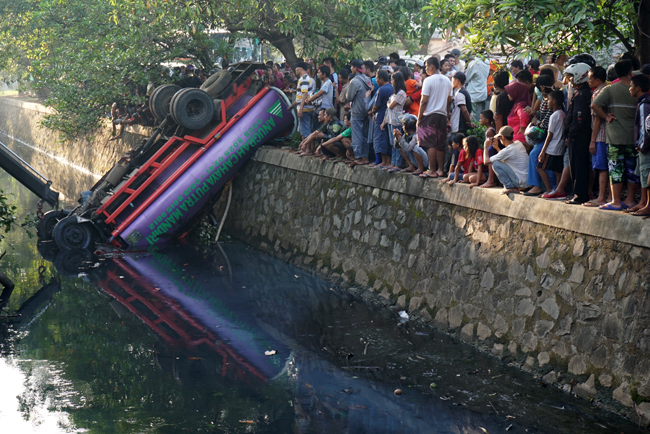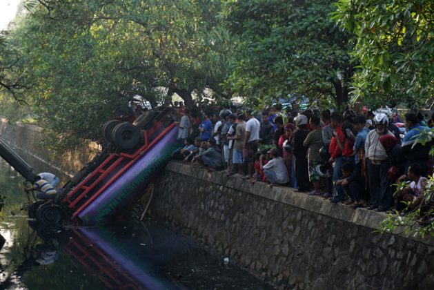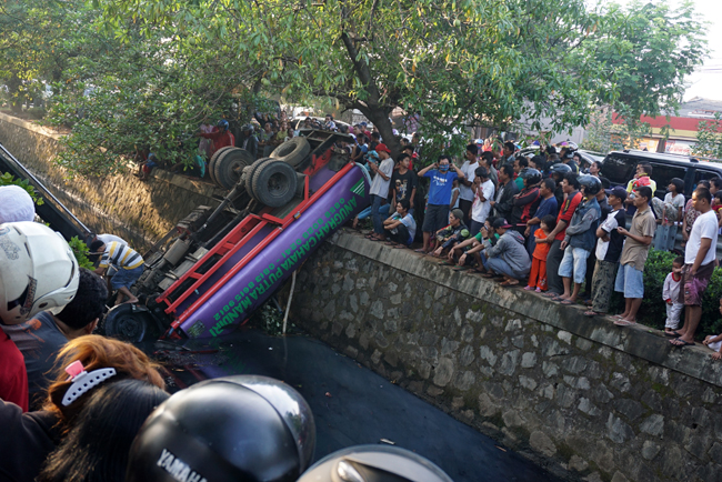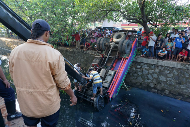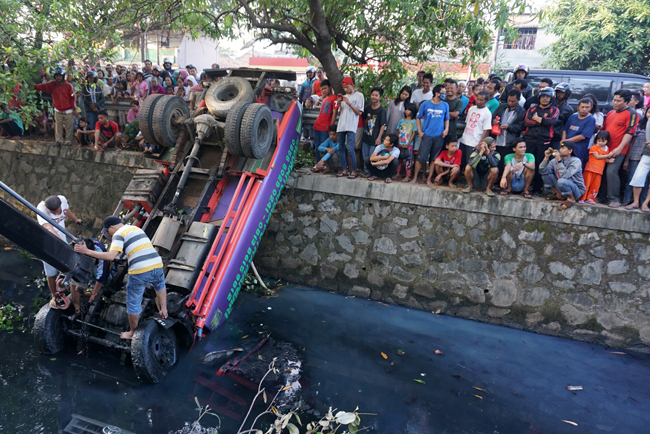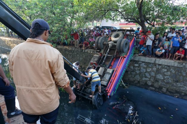 Tiga orang berusaha mengevakuasi truk tangki air isi ulang bernomor polisi B-9038-CFA terjun ke kali yang berada di antara Jalan Benteng Betawi, Tangerang, Banten, Rabu (11/6). Akibat kecelakaan tersebut 2 orang tewas di tempat. KataKota/Fajrin