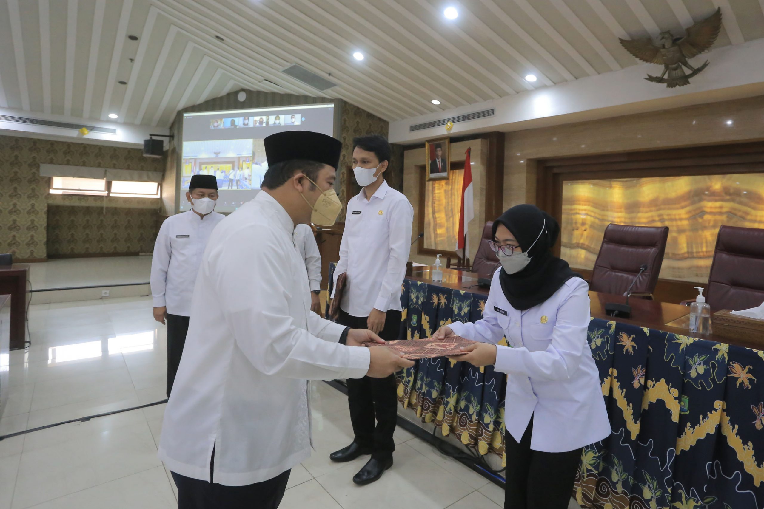 Wali Kota Tangerang H. Arief R. Wismansyah didampingi Sekretaris Daerah Herman Suwarman menyerahkan secara simbolis Surat Keputusan (SK) Pengangkatan kepada 118 Calon Pegawai Negeri Sipil (CPNS) Tahun 2021 Pemerintah Kota Tangerang yang diadakan secara daring dan luring di Pusat Pemerintahan Kota Tangerang, Jumat (08/04).