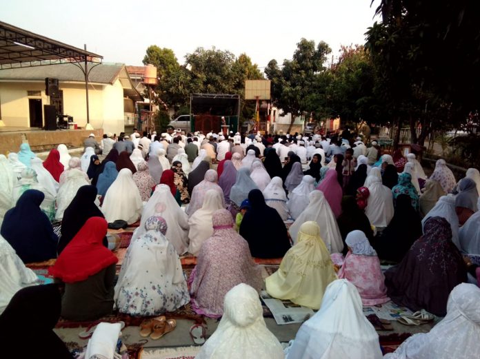 Tangerang, Katakota.com — Warga di perumahan Kunciran Mas Permai Kunciran, Pinang, Kota Tangerang hari ini telah menggelar shalat Idul Adha 1439 Hijriah, lebih awal dari yang ditetapkan oleh pemerintah. Pelaksanaan shalat berlangsung dengan khidmat di lapangan perumahan yang diikuti jamaah laki-laki dan perempuan, Selasa (21/8).
