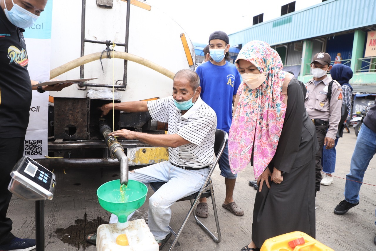 Pemerintah Kota Tangerang melalui Dinas Perindustrian Perdagangan Koperasi dan UKM (Disperindagkop UKM), bersama PD Pasar dan PT Rajawali Nusindo, mendistribusikan minyak goreng curah khusus untuk pedagang minyak goreng curah di Pasar Anyar, Selasa (29/3/22).