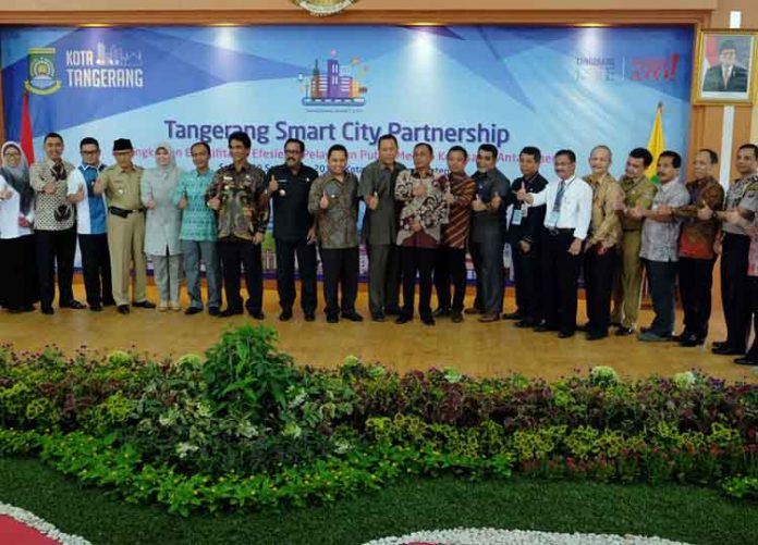 TANGERANG—Pemerintah Kota (Pemkot) Tangerang melakukan kerjasama dengan 16 daerah Kabupaten/Kota di Indonesia terkait pengembangan smart city, Selasa (20/9). Dalam kerjasama tersebut, Pemkot memberikan 153 aplikasinya secara gratis untuk dimanfaatkan oleh 16 daerah itu.