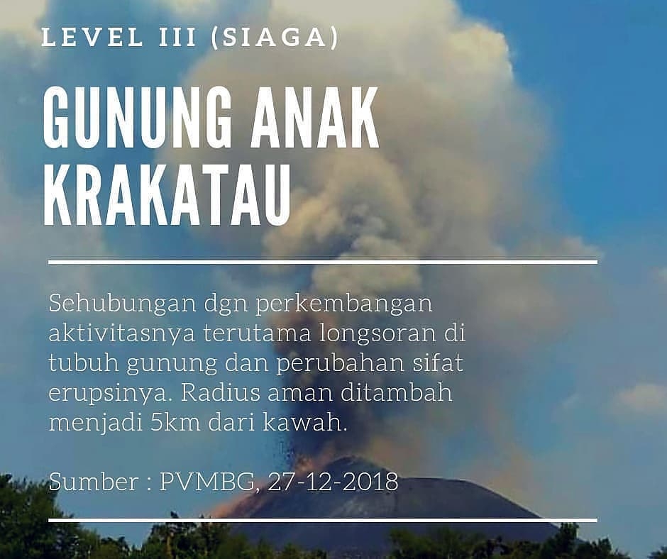 Status Gunung Anak Krakatau sendiri saat ini masih di level Waspada II. Daerah rawan bahaya pun sudah ditetapkan merentang dalam radius 2 kilometer dari kawah gunung.