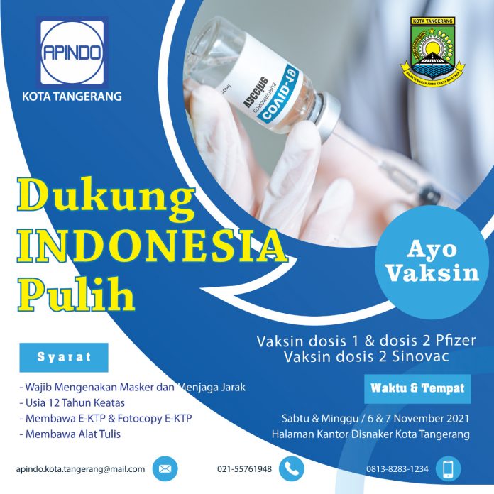 Apindo Kota Tangerang bekerjasama dengan Disnaker Kota Tangerang akan menggelar Program Vaksinasi Covid-19 bagi 2.000 masyarakat, pekerja dan pengusaha yang belum melakukan vaksinasi.