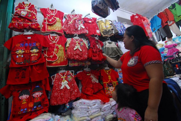 Seorang ibu memilih pakaian khas imlek yang di pajang di pasar anyar, Tangerang, Banten, Rabu (3/2). Menyambut perayaan tahun baru imlek 2567, penjualan baju bercorak khas imlek banyak diburu warga terutama untuk anak-anak. KataKota/Fajrin
