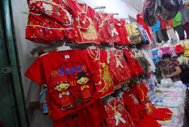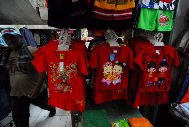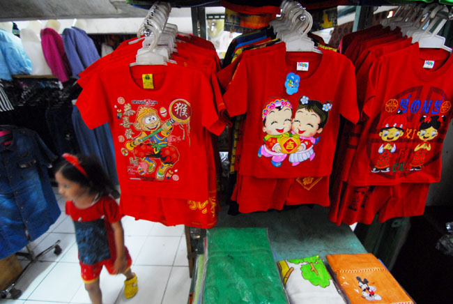 Seorang anak melintas di dekat pakaian khas imlek yang di pajang di pasar anyar, Tangerang, Banten, Rabu (3/2). Menyambut perayaan tahun baru imlek 2567, penjualan baju bercorak khas imlek banyak diburu warga terutama untuk anak-anak. KataKota/Fajrin