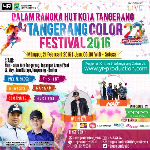 Tangerang, Katakota.com – Dalam rangka memeriahkan Hari Ulang Tahun Kota Tangerang ke 23 Tahun, anak – anak muda Kota Tangerang yang terkumpul dalam YR Production mengadakan Tangerang Color Festival 2016, Minggu (21/02) di Lapangan Ahmad Yani dan akan diikuti ribuan peserta.