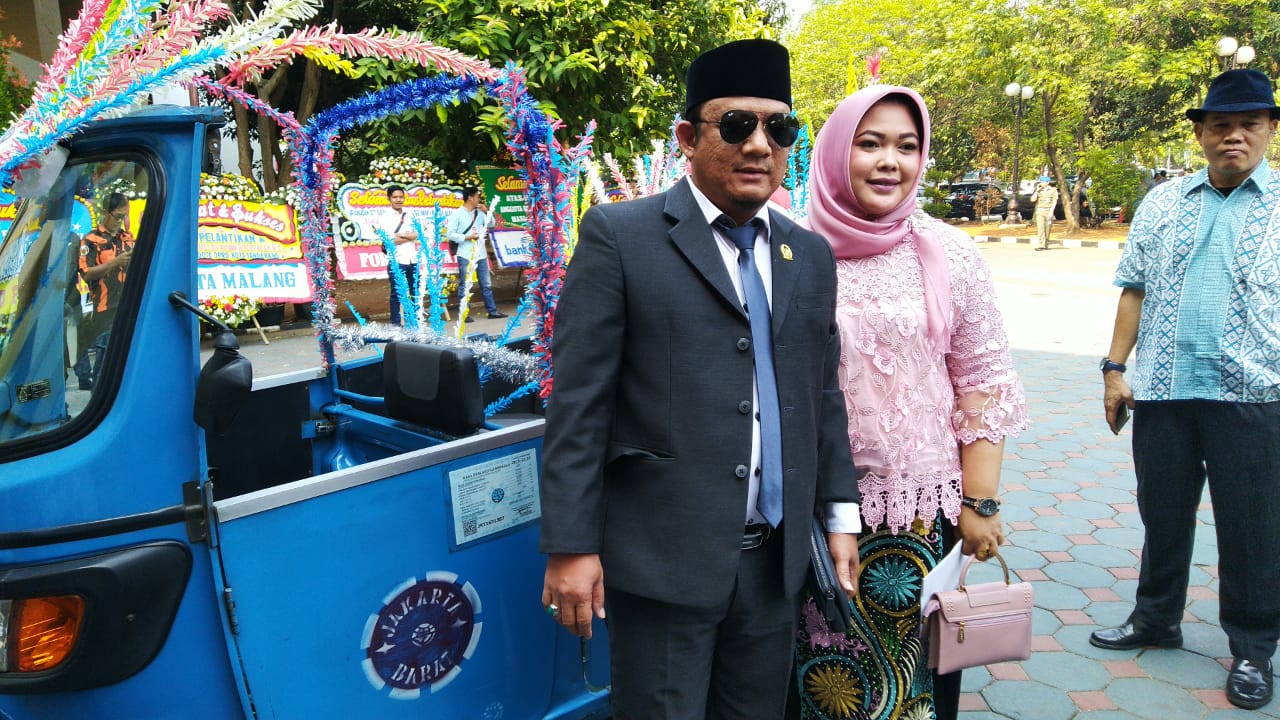 Tangerang, Katakota.com– Cara unik dilakukan anggota DPRD Kota Tangerang Dedi Hasbullah saat menghadiri pelantikan DPRD periode 2019-2024 pada Senin (2/9) di gedung Puspemkot. Politisi Partai Amanat Nasional (PAN) ini mengendarai bajaj bersama sang istri dari rumahnya di kawasan Tanah Tinggi.