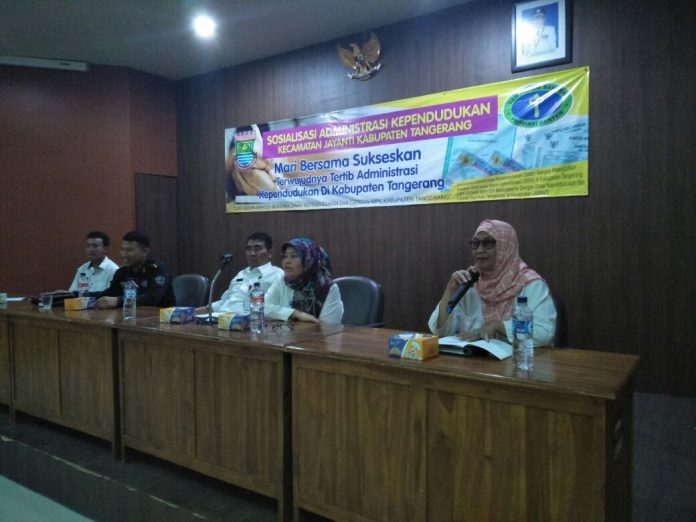 Tangerang, Katakota.com – Pemerintah Kabupaten Tangerang melalui Dinas Kependudukan dan Catatan Sipil Bersama LSM Geram Banten menggelar sosialisasi Kebijakan Tertib Administrasi Kependudukan dan Pencatatan Sipil di Aula Kecamatan Jayanti Rabu, (28/02/2018).