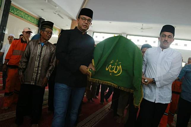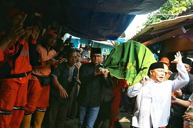 3. Bersama beberapa pasukan oranye, Anies Baswedan turut mengangkat keranda jenazah menuju masjid untuk disalatkan.