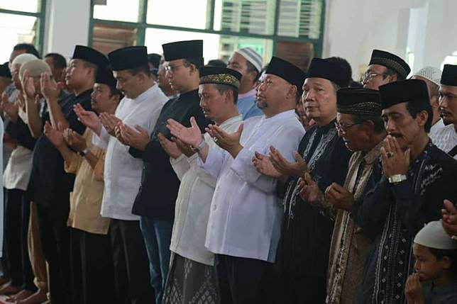 7. Anies Baswedan bersama para melayat yang ikut menyalatkan jenazah tengah berdoa untuk almarhum Naufal.