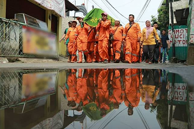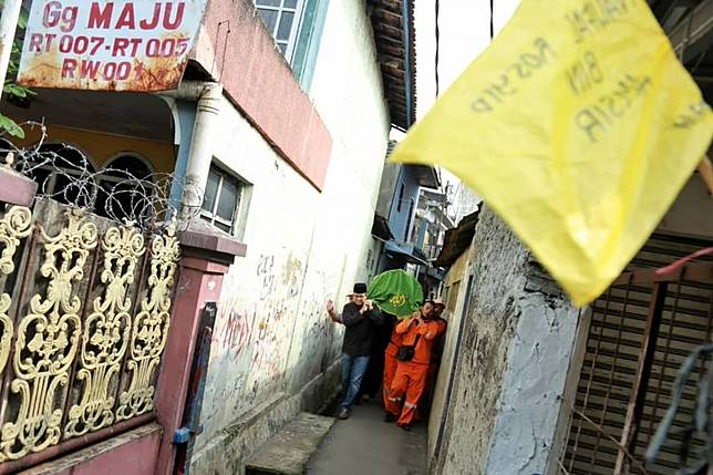 8. Anies dan pasukan oranye harus melintasi gang sempit untuk membawa jenazah hingga ke lokasi pemakaman.
