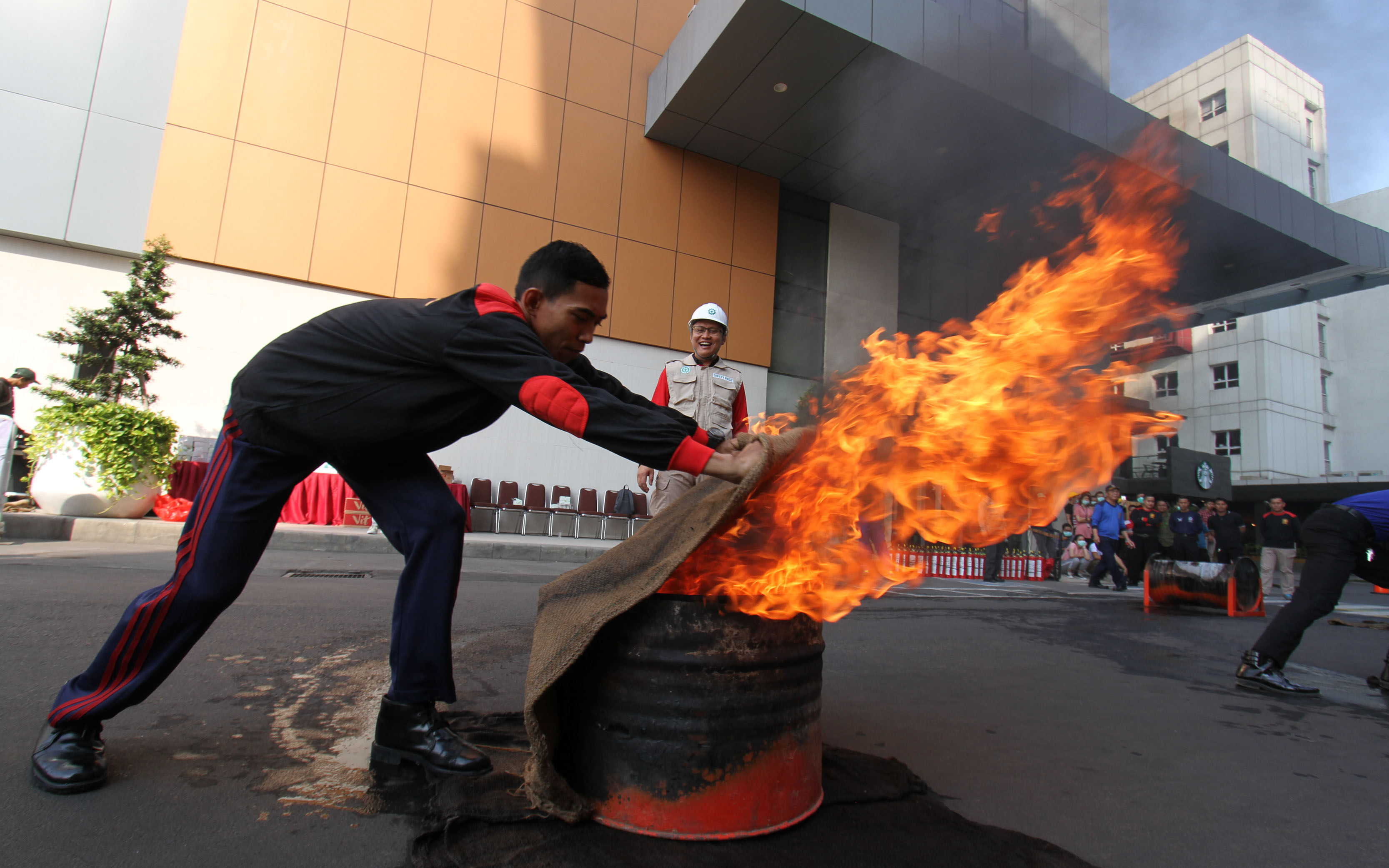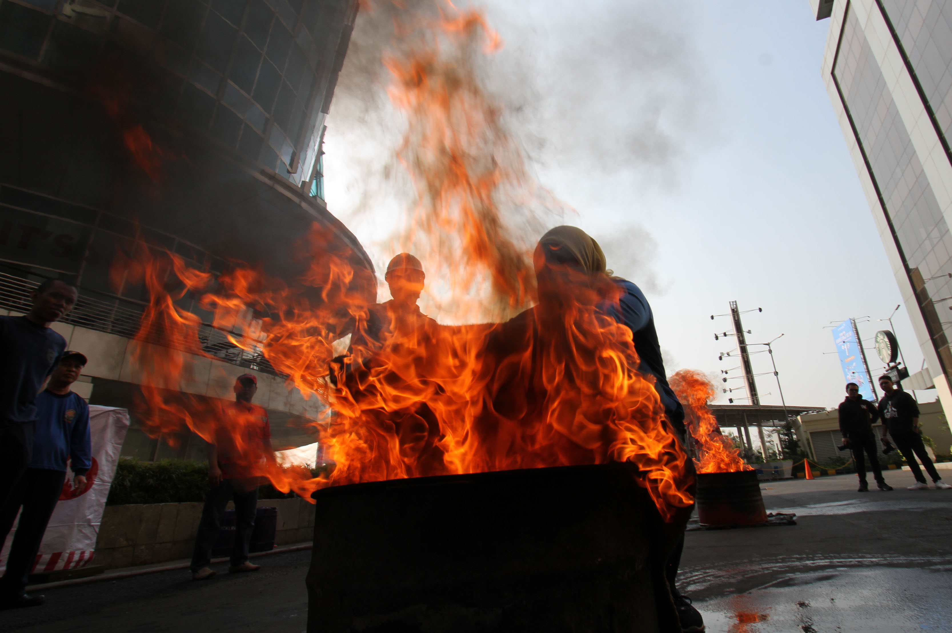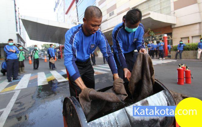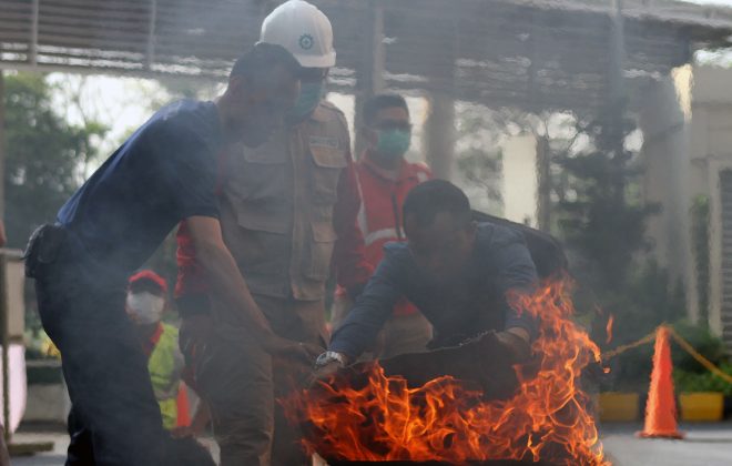 Pengelola pusat perbelanjaan Tangcity Mal bersama Badan Penanggulangan Bencana Daerah Kota Tangerang mengadakan simulasi penanganan kebakaran di areal parkir Tangcity Mall. Kegiatan ini dilakukan berkala dan intensif untuk meningkatkan kesadaran karyawan mall dan tenant terhadap bahaya kebakaran. Foto:Adrianto/Indopos