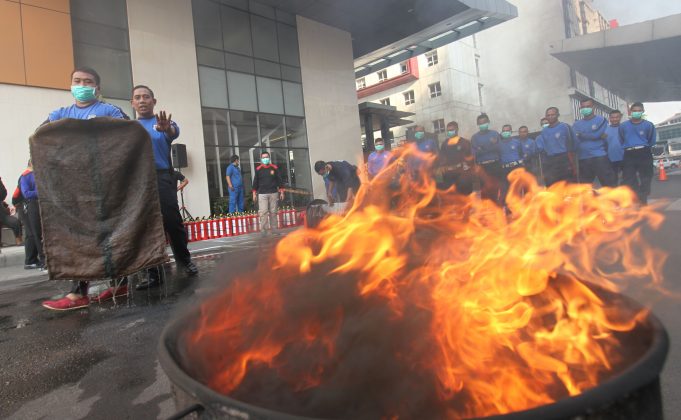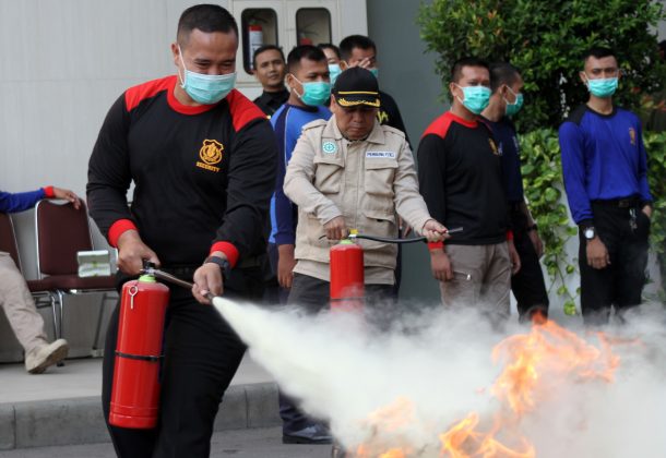 Karyawan mal Tangerang City berlatih penanggulangan kebakaran, Senin (7/10). Kegiatan ini sebagai langkah upaya antisipasi meminimalisir dampak dari peristiwa kebakaran yang terjadi. Foto : HO/Katakota
