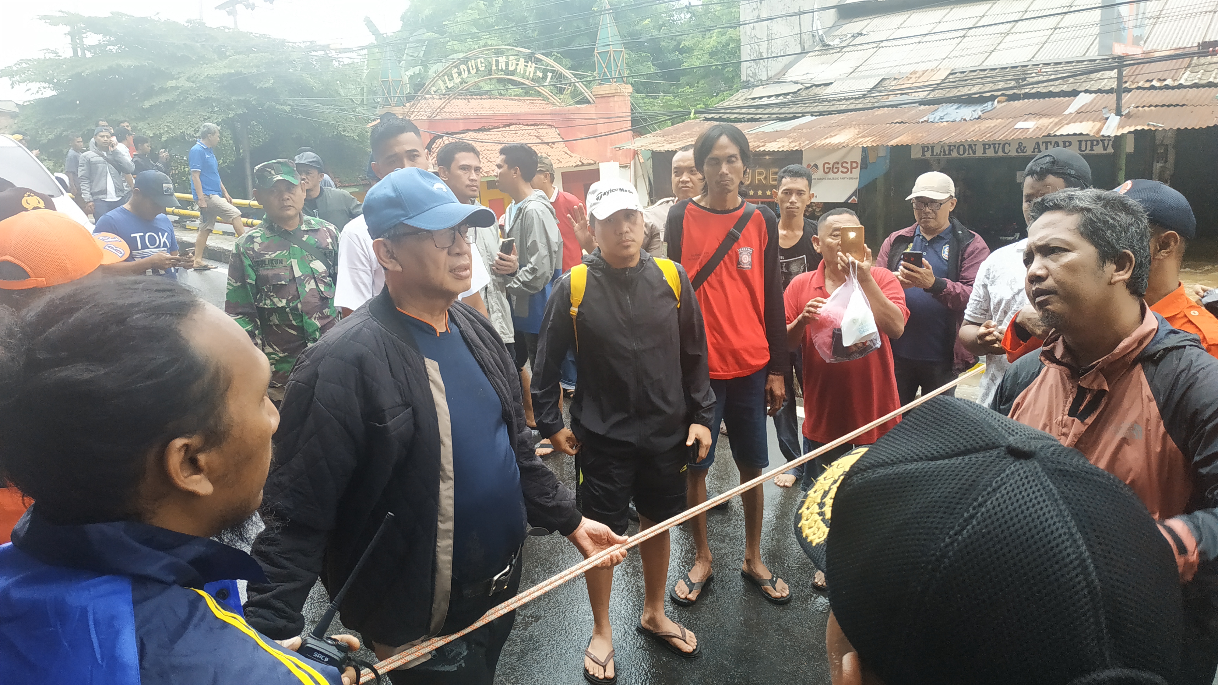 Mengenakan baju setelan santai Wahidin melihat langsung dampak banjir di jalan KH. Hasyim Ashari, Ciledug yang memutus jalur transportasi karena ketinggian mencapai satu meter lebih.