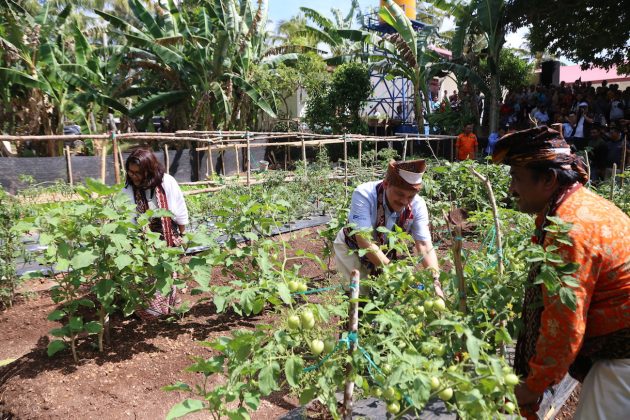 Kepala Lembaga Pengembangan Mutu Pendidikan Prov NTT Drs. H. M Irfan, MM (kanan), Ketua Pengurus Yayasan Pendidikan Astra-Michael D. Ruslim (YPA-MDR) Herawati Prasetyo (kiri) dan Head of Environment & Social Responsibility PT Astra International Tbk Riza Deliansyah (tengah) memanen perdana tomat, terong dan cabe di tempat pembibitan sayuran (demplot) SDN 1 Buraen, Kecamatan Amarasi Selatan, Kabupaten Kupang, NTT. Pada hari ini (12/5) juga diresmikan gedung sekolah SDN 1 Buraen yang merupakan salah satu SD binaan YPA-MDR dalam acara Festival KBA Kupang, NTT. SDN 1 Buraen adalah sekolah tertua di Amarasi Selatan yang dibangun pada tahun 1928. Foto : Astra for Katakota.com