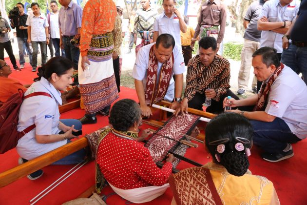 Head of Environment & Social Responsibility PT Astra International Tbk Riza Deliansyah (kanan) dan Direktur PT United Tractors Tbk Edhie Sarwono berbincang dengan salah satu penenun mengenai motif khas Amarasi dalam Festival KBA Kupang, NTT (12/5). Foto : Astra foro katakota.com
