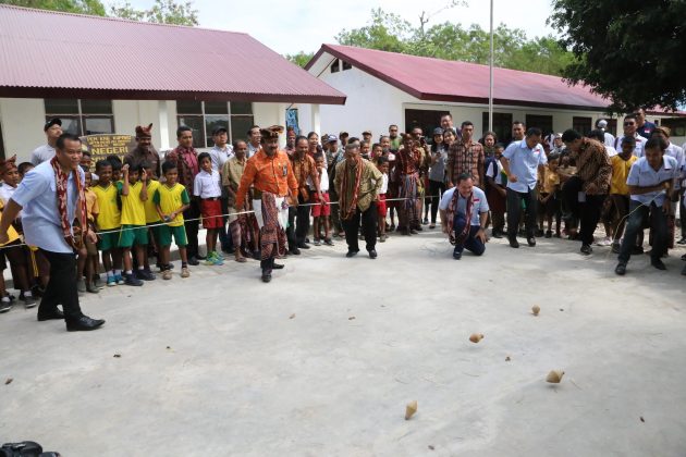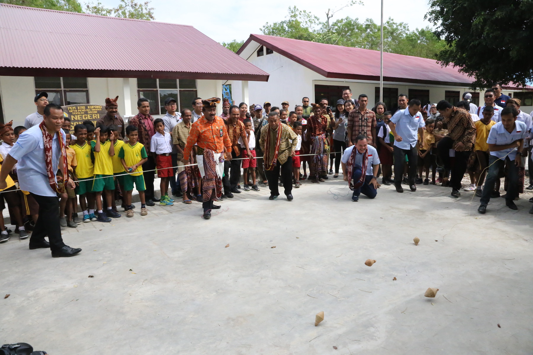 Kepala Lembaga Pengembangan Mutu Pendidikan Provinsi NTT Drs. H. M Irfan, MM (kedua dari kiri), Sekda Kabupaten Kupang Drs. Joni Nomseo M.Si (tengah), Head of Environment & Social Responsibility PT Astra International Tbk Riza Deliansyah (keempat dari kanan) mencoba permainan tradisional gasing bersama-sama murid SDN Sonraen dalam Festival KBA Kupang, NTT (12/5). Foto : Astra for Katakota.com