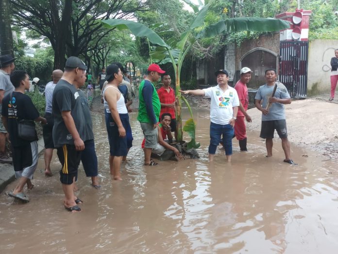 Tak kunjung diperbaiki jalan dan saluran air oleh pihak pengembang yakni PT. Cahaya Baru Raya Reality (PT.CBRR), warga Taman Royal 1 dan 3 kembali tanam pohon Pisang di tengah jalan rusak, Minggu (1/3/20).