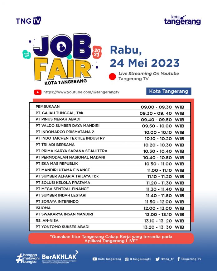 “Bagi para pencari kerja yang ingin mengetahui informasi terkait 18 perusahaan yang membuka lowongan. Seperti, lowongan apa saja yang dibuka, sistem kerjanya, atau bahkan ingin berinteraksi tanya jawab dengan perusahaan yang dituju. Pencari kerja bisa memanfaatkan siaran live streaming channel youtube Tangerang TV mulai pukul 09.00 WIB hingga selesai,” pungkasnya.