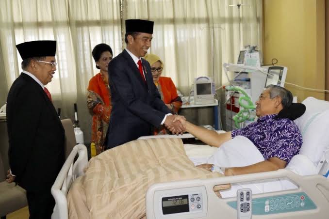 Kedua pimpinan negara itu kompak mengenakan setelan jas berwarna hitam. Mereka tidak lama menjenguk SBY hanya sekitar 10 menit.