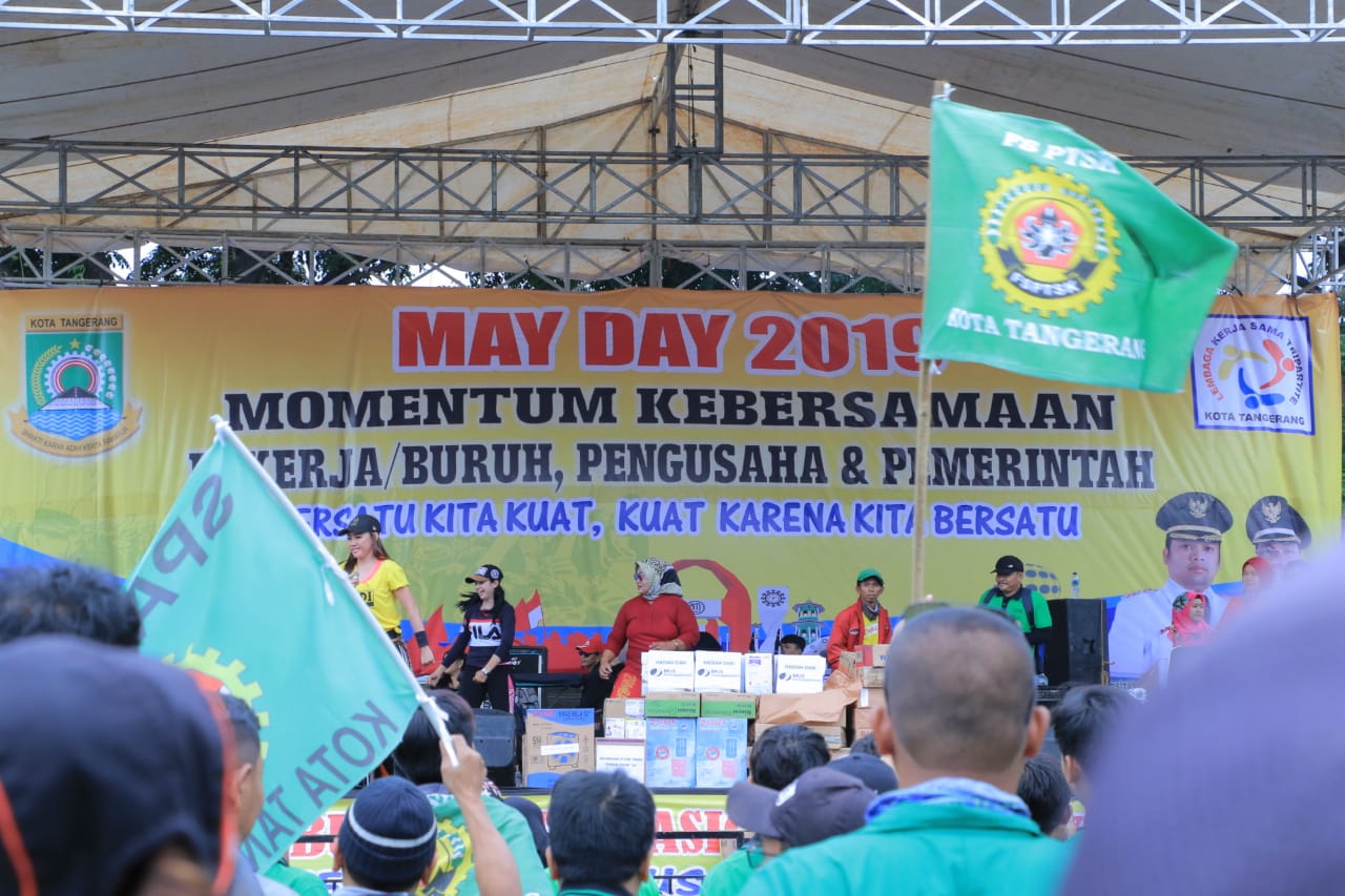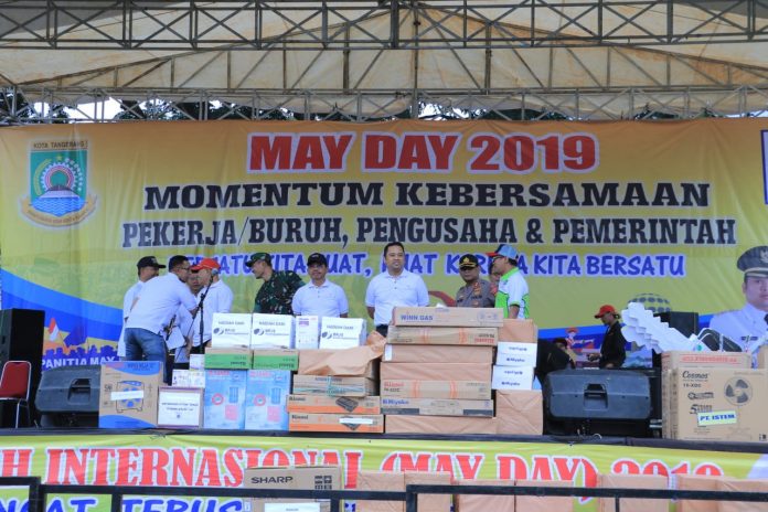 Tangerang, Katakota.com– Hari Buruh 2019 di Kota Tangerang diperingati dengan cara berbeda. Ribuan buruh yang berasal dari berbagai serikat pekerja di Kota Tangerang berkumpul di Lapangan Ahmad Yani, dengan menggelar senam massal, bagi-bagi doorprize dan bazar sembako murah.