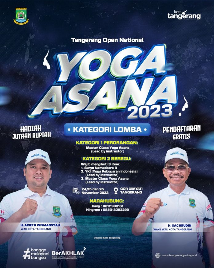 Katakota- Dinas Pemuda dan Olahraga (Dispora) Kota Tangerang yang berkolaborasi dengan Pemuda Pemudi Ahmad Yani (Pepaya) dan PPYNI Kota Tangerang akan menggelar Tangerang Open National Yoga Asana 2023, di GOR Damyati, Kota Tangerang pada 24-26 November mendatang. Diketahui, pagelaran ini merupakan perdana di Indonesia.