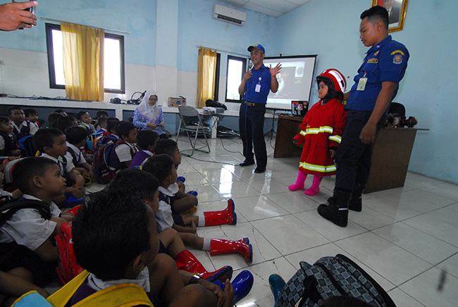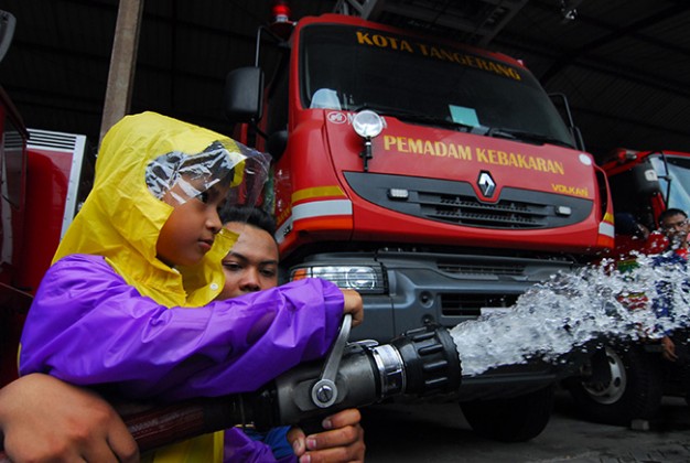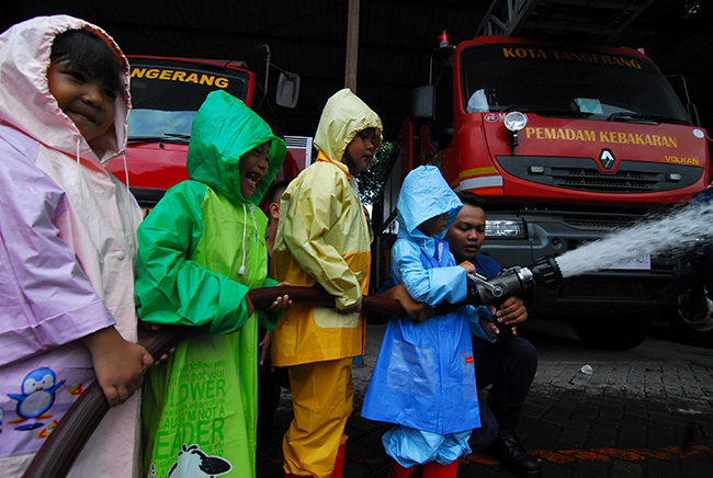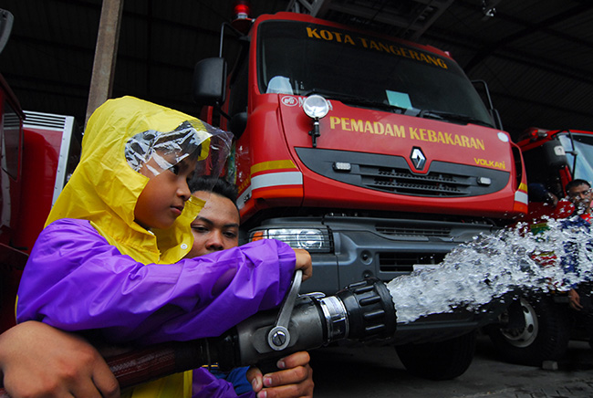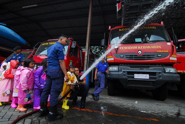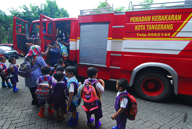 Murid Taman Kanak-Kanak (TK) Dharma Mulya ketika melakukan kunjungan di Damkar Kota Tangerang, Tangerang, Banten, Kamis (18/2). Kegiatan itu merupakan pendidikan langsung sejak usia dini untuk mengenalkan lebih dekat peran dan tugas seorang pemadam Kebarakan di kala bencana kebakaran terjadi. KataKota/Fajrin