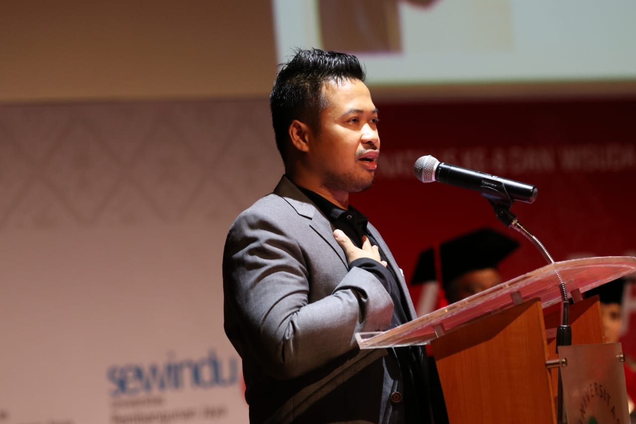 Aakar membakar semangat para wisudawan untuk dapat memanfaatkan sesuatu yang lekat dengan keseharian yakni gawai dan media sosial.