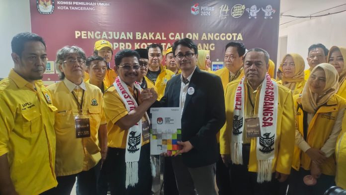 Katakota com- Ketua DPD Golkar Kota Tangerang H.Sachrudin memimpin rombongan pendaftaran 50 Bacaleg partai berlambang pohon beringin ke Kantor KPUD Kota Tangerang di Jalan Nyimas Melati pada Sabtu (13/5).